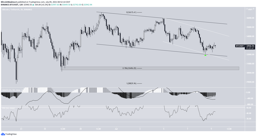 Курс BTC отскочил 8 июля от области поддержки, сформированной схождением линий поддержки этих двух каналов (зеленый значок).