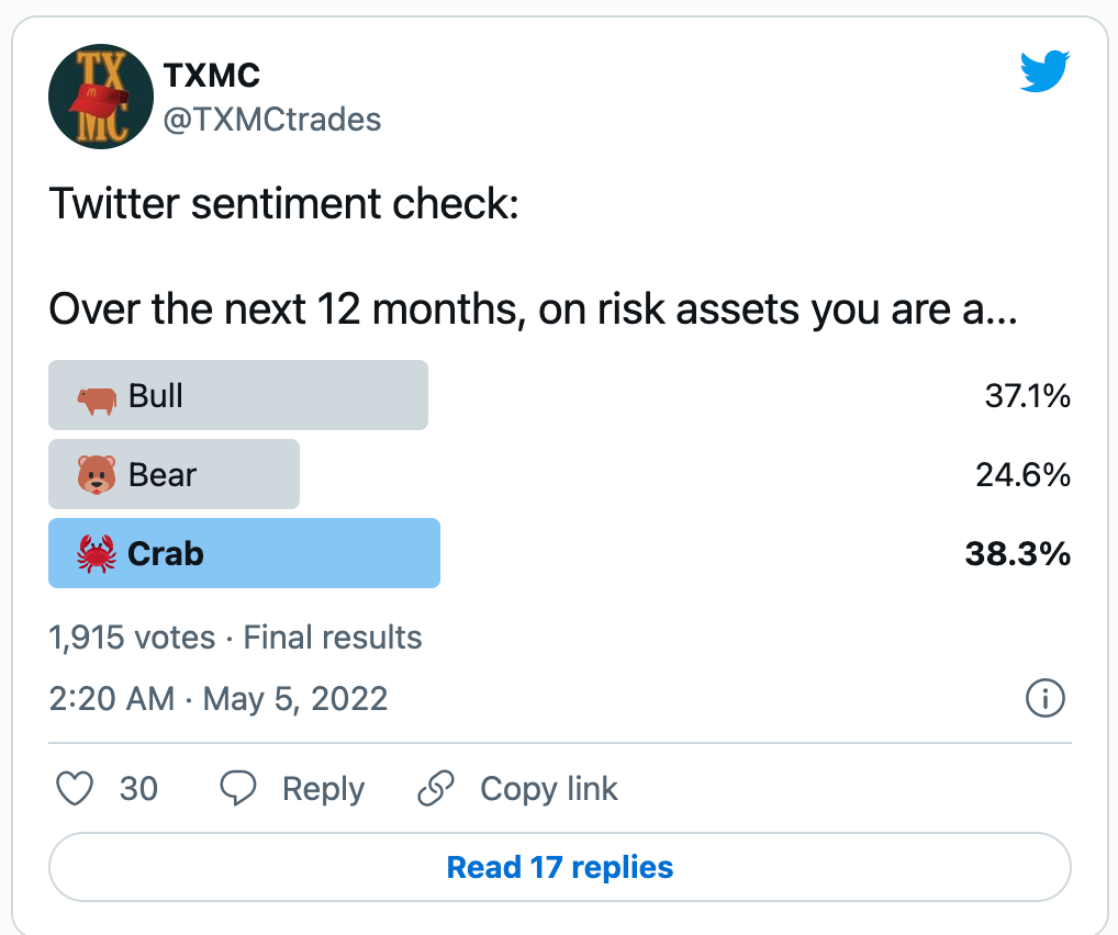 Известный в твиттере ончейн-аналитик @TXMCtrades провел опрос и получил интересный результат. Пятого мая он спросил своих читателей о том, как они настроены в отношении рисковых активов в ближайшие 12 месяцев.
