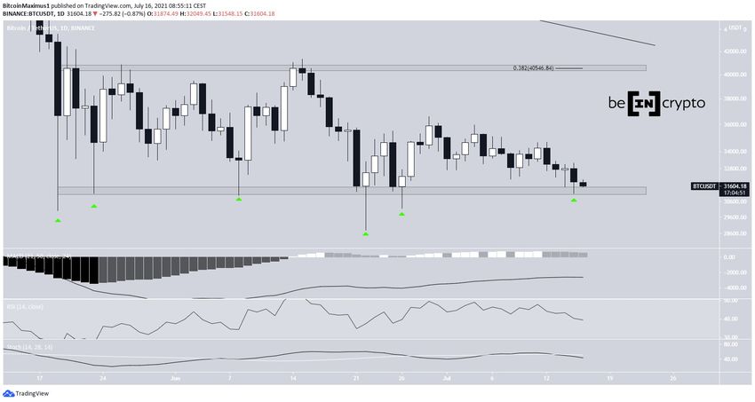 Биткоин (BTC) отметил 15 июля минимум на $31 113. Это стало возможным в результате формирования крупной медвежьей свечи, которая нивелировала бычий молот от 14 июля. В итоге курс BTC уже в шестой раз коснулся области горизонтальной поддержки $31 300 (зеленый значок).