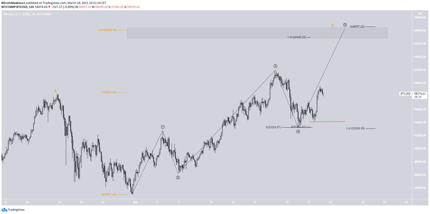 Результаты волнового анализа предполагают, что курс BTC находится в подволне 5 (оранжевый цвет на графике) волны 5 (белый цвет). Это часть бычьей импульсной ценовой структуры, берущей свое начало от уровней марта 2020 года.