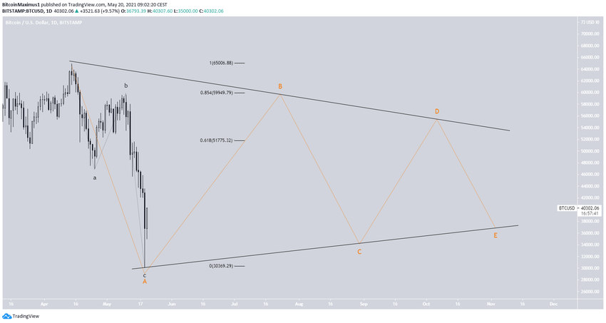 Коррекция предполагает завершение фазы роста, начавшейся в марте 2020 года. Соответственно, биткоин сейчас находится внутри волны 4 (красный цвет), которая, как было отмечено выше, может развиться в треугольник.
