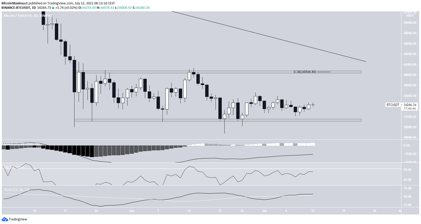 На дневном графике биткоин с 19 мая торгуется внутри диапазона $31 300 – $40 550. 22 июня цена отскочила от линии поддержки этого диапазона (зеленый значок), 26 июня сформировала повышающийся минимум и с тех пор пытается расти.