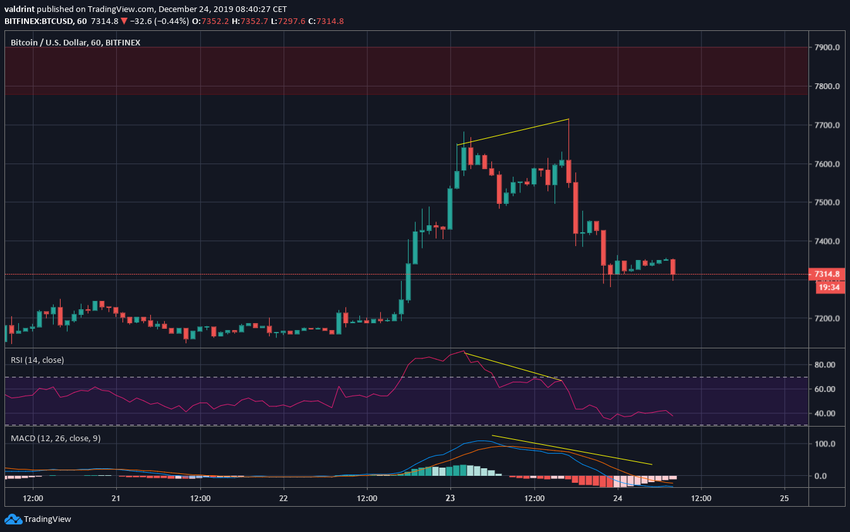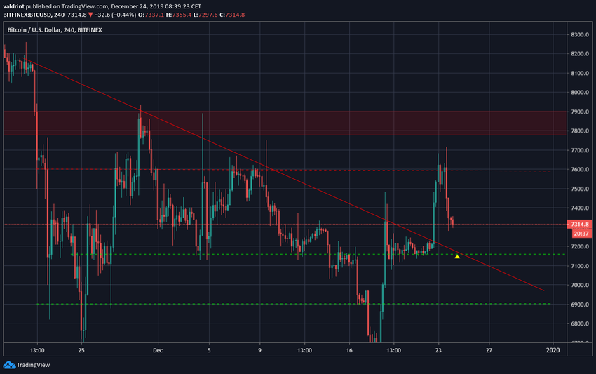 С 18 декабря курс биткоина вырос на 20%. Однако вчера это ралли оборвалось в районе $7715, и цена отступила к поддержке.