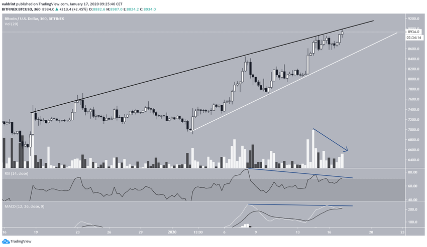 Таким образом, курс биткоина достиг важной области сопротивления. Хотя долгосрочные таймфреймы сулят паре бычий прорыв, краткосрочные графики сохраняют медвежий настрой. Пока цена продолжает торговаться внутри паттерна краткосрочный восходящий клин, мы более склонны ожидать снижения.
