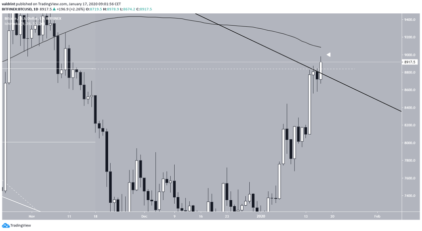 На дневном графике ситуация выглядит иначе, чем на краткосрочных таймфреймах. Здесь цена активно занята пробоем линии долгосрочного нисходящего сопротивления. Его чистый прорыв подтвердит завершение нисходящего тренда, поддерживавшегося с 24 июня 2019 года.