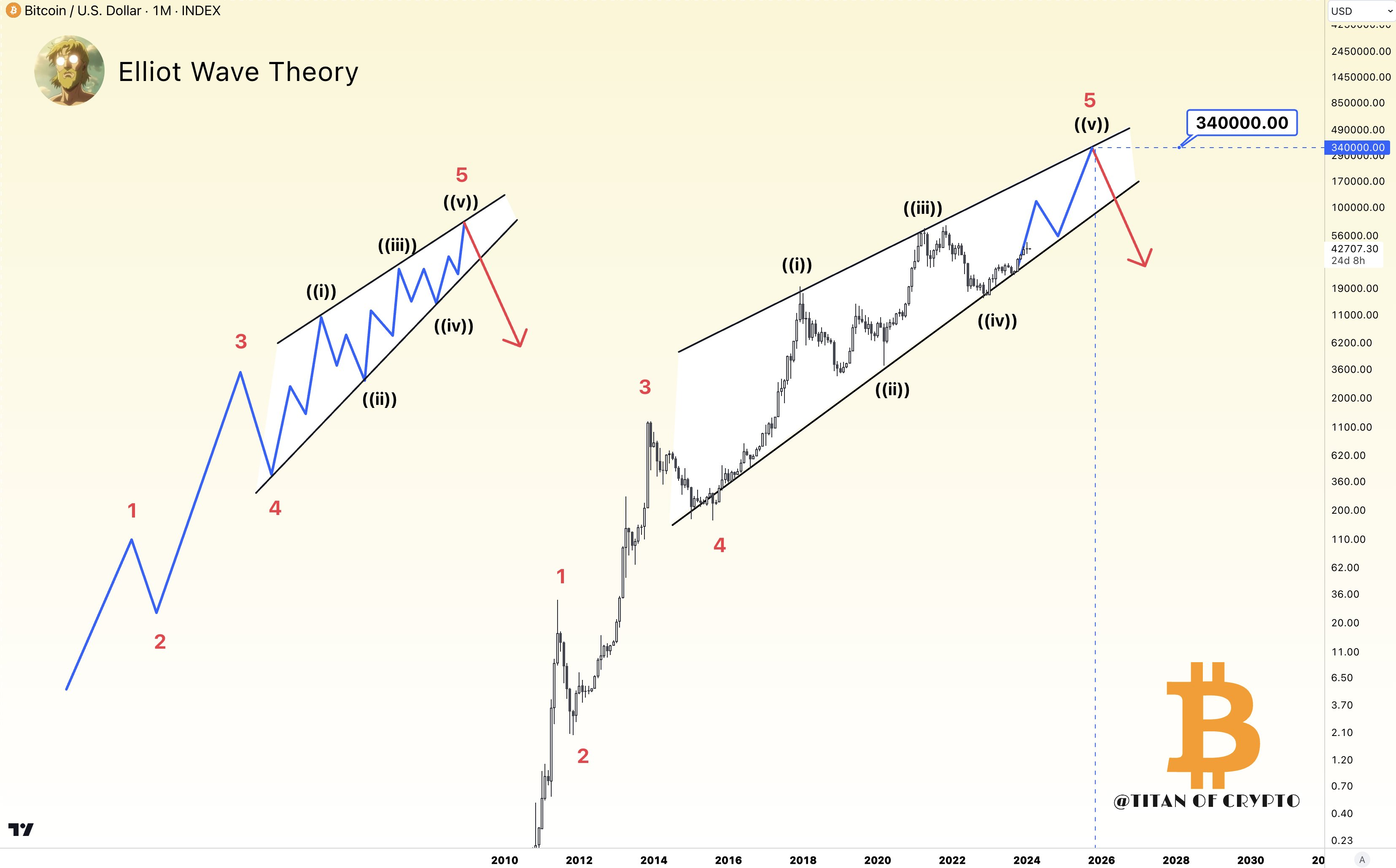 Инвестор и трейдер Titan of Crypto дал менее позитивный прогноз биткоина на начало 2025 год. По его подсчетам, построенным на волновой теории Эллиота, весь следующий год криптовалюта проведет в позитивном движении к обновлению максимума на уровне $340 тыс.