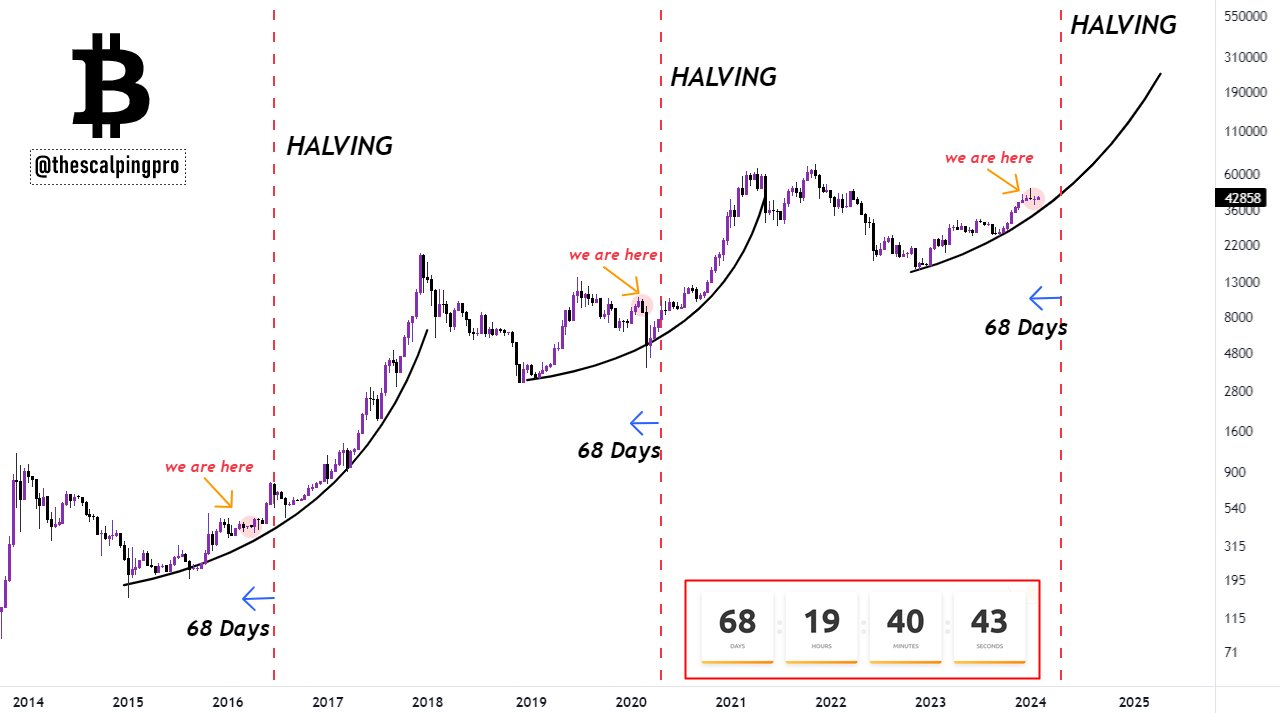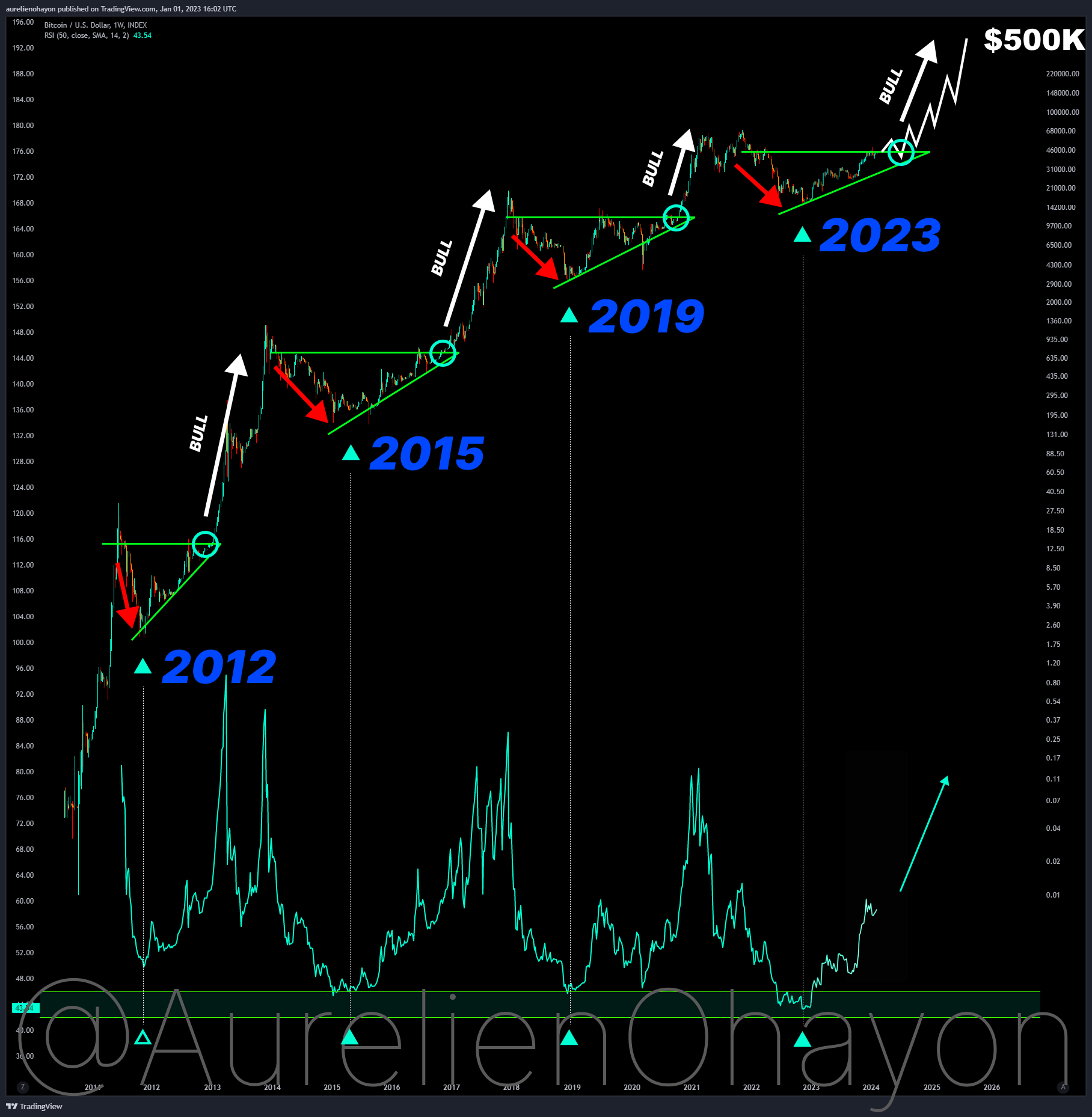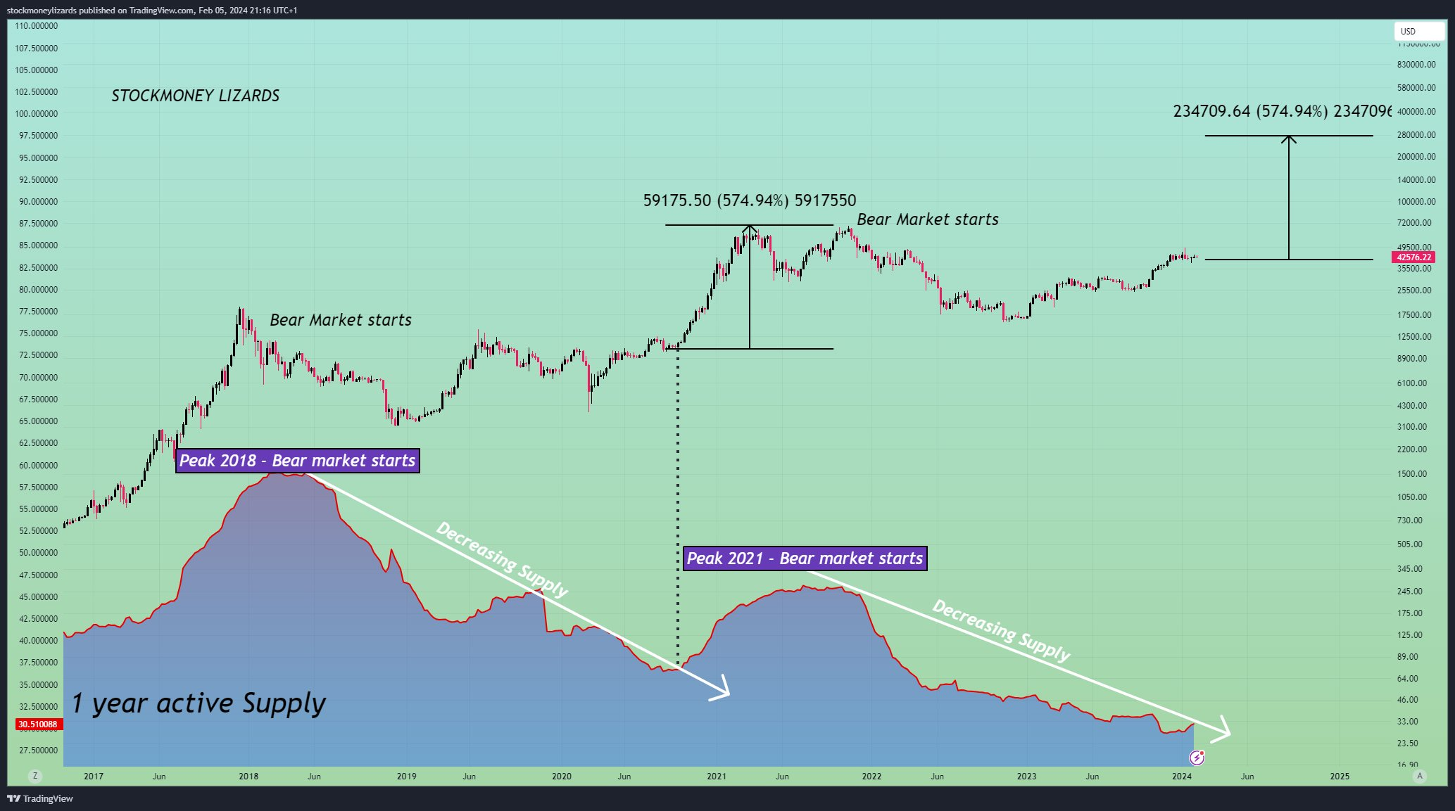Также своим мнением о том, сколько будет стоить биткоин через год, поделился технический аналитик Mags. Он считает, что на фоне халвинга к началу 2025 года BTC может приблизиться к уровню $300 тыс. По мнению аналитика, снижение скорости майнинга биткоина выведет криптовалюту в параболический рост.