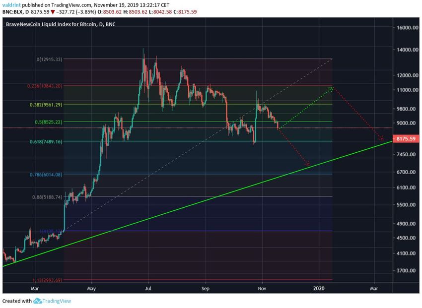 Впрочем, даже в случае такого отскока курс биткоина может в конечном итоге снизиться к этой линии поддержки – которая на тот момент уже может располагаться на более высоких уровнях. Мы полагаем, что в январе 2020 года она будет проходить в районе $7000.