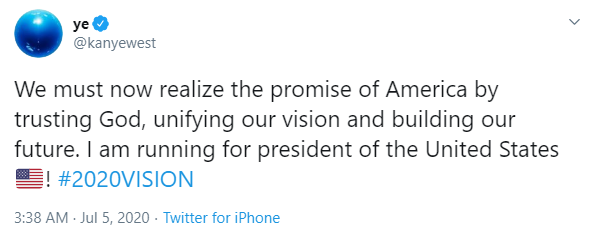 Музыкант и криптоэнтузиаст Канье Вест заявил на своей странице в Twitter, что собирается баллотироваться на пост президента США уже в этом году. В частности, он написал, что «теперь мы должны реализовать обещание Америки, доверяя Богу, объединяя наше видение и строя наше будущее. Я баллотируюсь на пост президента Соединенных Штатов».