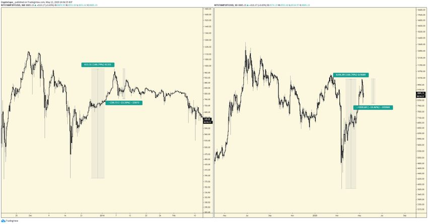На графике ниже изображена текущая динамика и поведение биткоина в январе 2014 года в нижней и верхней частях соответственно. Действительно, глядя на график можно с уверенностью сказать, что в обоих случаях токен поднялся на одинаковую величину и затем показал аналогичную первоначальную коррекцию.Помимо этого, есть и другие сходства двух фракталов. В частности, перед достижением дна биткоин формировал три понижающихся максимума, а в ходе отступления откатывался почти на 100% относительно предыдущего максимума.