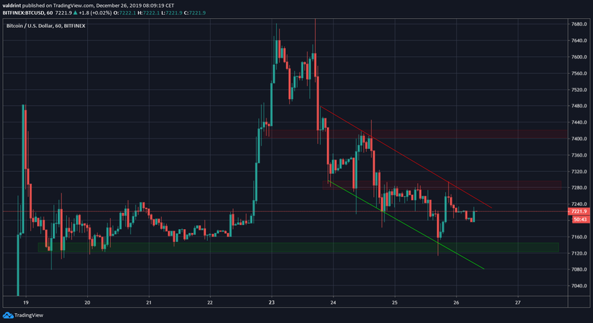 Кроме того, один раз паре удалось достичь незначительной области поддержки на $7140, где она сформировала свечу с длинным нижним фитилем и после этого начала рост в направлении предыдущего уровня прорыва и линии нисходящего сопротивления.