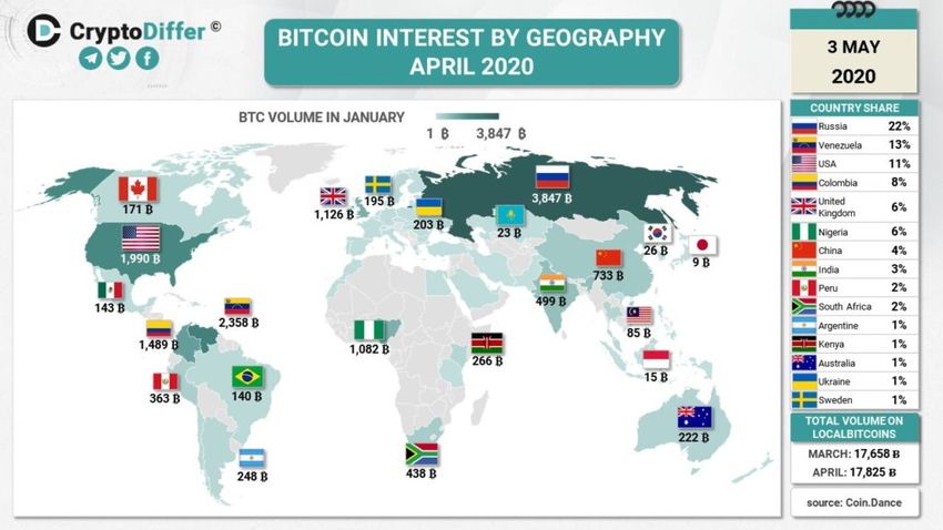 Согласно исследованиям Coin.Dance, в апреле 2020 года в России хранилось 3847 биткоинов, что в долларовом эквиваленте превышает 34,5 млн., это составляет 22% от всех локальных биткоинов в мире. Следом за Россией следует Венесуэла, которая является держателем 2358 ВТС или $21,2 млн. или 13% от всех локальных биткоинов.