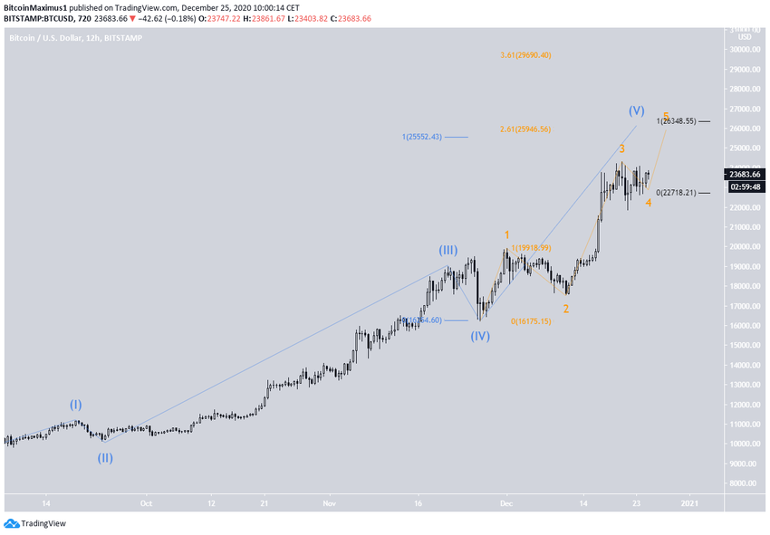 На более коротких таймфреймах биткоин торгуется внутри подволны 4, более детальный подволновой анализ которой выделен на графике черным цветом. Снижение под $22 624 нейтрализует этот сценарий.