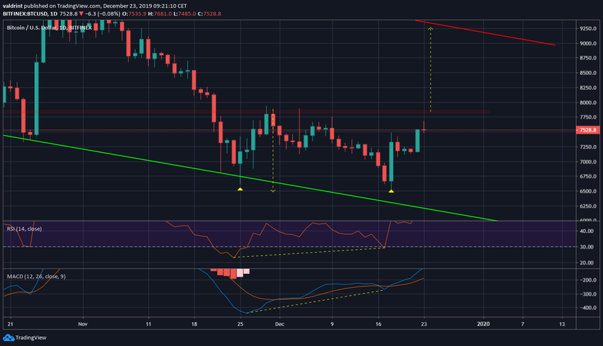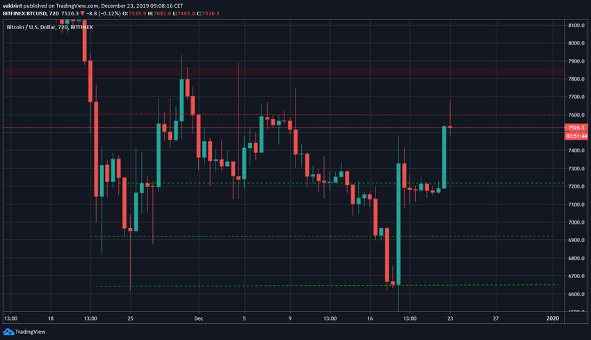 Сейчас целью быков является область предыдущего медвежьего прорыва на $7600. Успешное закрытие выше этого уровня станет указанием на то, что предыдущий ход цены оказался ложным прорывом и теперь биткоин продолжит рост.