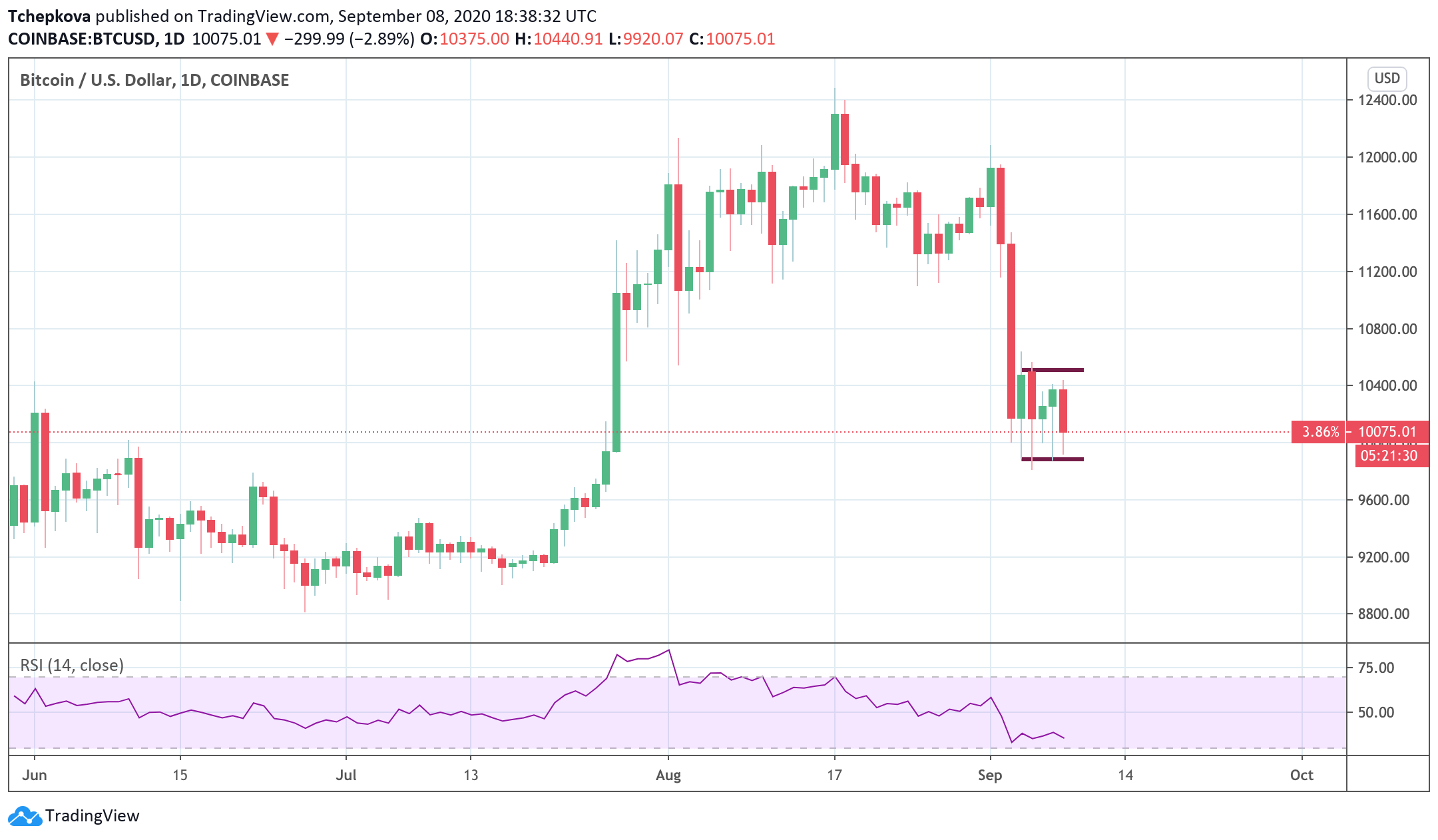 С технической точки зрения, BTC/USD по-прежнему находится в узком диапазоне $9800 — $10500. Устойчивое движение в любом направлении поможет создать мощный импульс. Критическая поддержка находится на уровне $9000, и если цена снова начнет падать после нынешней консолидации, то этот барьер замедлит наступление медведей и создаст предпосылки для новой бычьей волны.