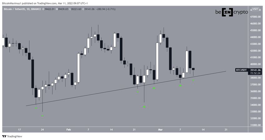 Биткоин растет, с 22 января двигаясь над линией восходящей поддержки. BTC уже семь раз проверял ее на прочность. В последний раз это произошло 11 марта (зеленые значки).