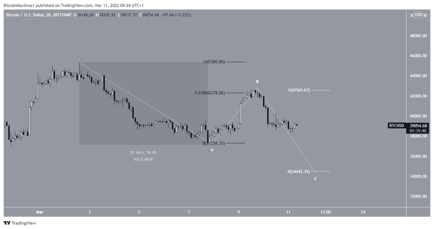 Результаты долгосрочного волнового анализа по-прежнему остаются неясными, а краткосрочный анализ предполагает, что снижение курса BTC 2-7 марта (выделено на графике) представляло собой пятиволновую нисходящую структуру.