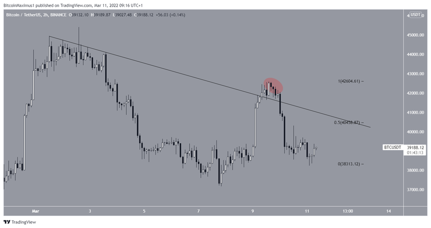 9-10 марта BTC пытался сформировать свечу медвежьего поглощения, но в итоге вместо закрытия цены ниже $38 600 на графике появился лишь небольшой нижний фитиль. Таким образом, паттерн не был подтвержден.