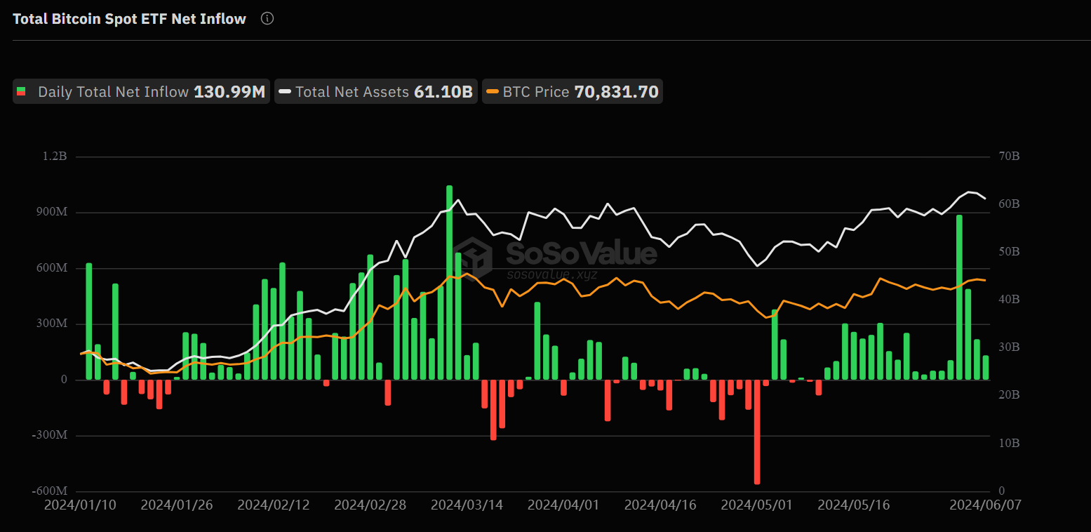 ETF зафиксировали притоки средств в течение 19 последовательных дней, превысив предыдущий рекорд в 17 дней. Согласно данным SoSo Value, общая сумма на 7 июня составила $15,69 млрд. Доминирующим игроком остается траст iShares от BlackRock (IBIT) с чистыми активами в $21,07 млрд.