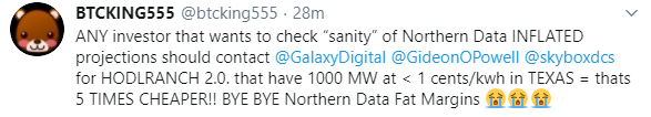 “Наш источник в Германии сообщает нам, что @NintageDataAG испытывает трудности с реализацией запланированных 1000 МВт к концу года. Клиенты либо хотят снизить цены, либо рассматривают множество других вариантов в Техасе”.