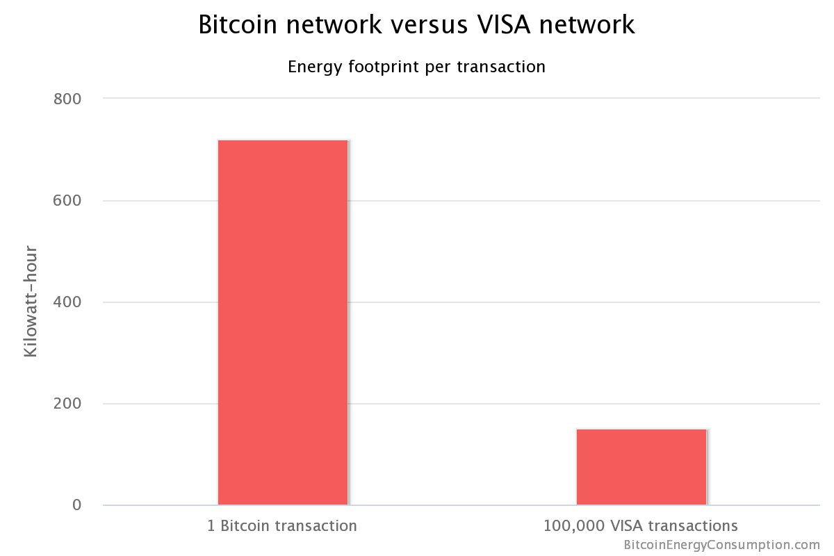 На одну транзакцию ВТС необходимо 721 кВт/ч электроэнергии. Для сравнения: на 100 000 транзакций Visa расходуется всего 151 кВт/ч. То есть, сеть биткоин потребляет глобально больше электроэнергии, чем Visa и другие платежные системы.