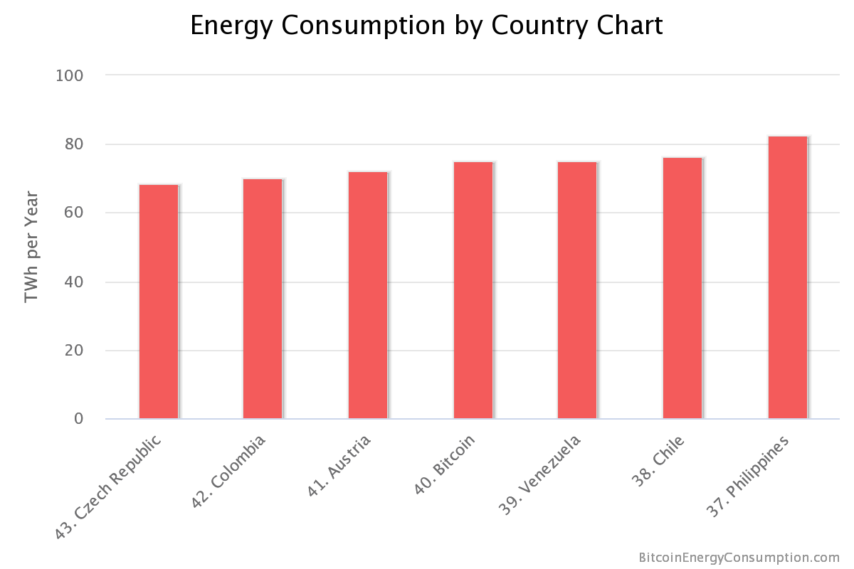 Только в 2019 году майнеры использовали 74,93 ТВт/ч электроэнергии, что сравнимо с годовым потреблением электроэнергии Венесуэлой. При этом углеводородный след составляет 35,59 млн. тонн СО2. Столько же за год генерирует вся Новая Зеландия. Сегодня вся сеть биткоин потребляет больше электроэнергии, чем ряд стран, таких как Венесуэла, Чили и Филиппины.
