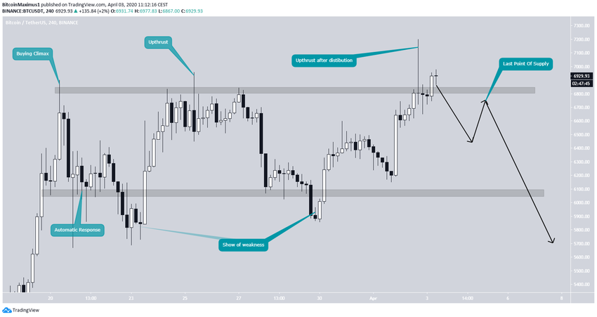 Итак, BTC, возможно, следует за моделью распределения Вайкоффа. В случае закрытия ниже $6750 на 4-6 часовых графиках, цена может продолжить снижение с выходом из текущей фигуры клин.