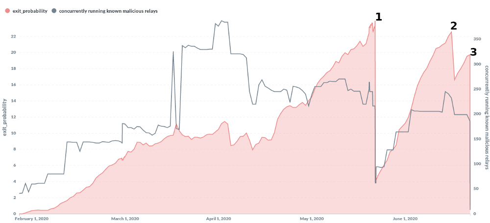 На рисунке показано, какая накопленная часть выходной мощности сети Tor контролировалась злоумышленником и сколько подтвержденных злонамеренных ретрансляторов работали одновременно (пиковое значение – более 380 ретрансляторов). Рисунок также показывает, что если пользователь открыл браузер Tor на пике атаки в 2020–05–22, то у него был шанс 23,95% в конечном итоге выбрать управляемое злоумышленником реле выхода Tor. Поскольку клиенты Tor обычно используют множество реле выхода Tor, вероятность использования злонамеренного реле выхода со временем увеличивается.
