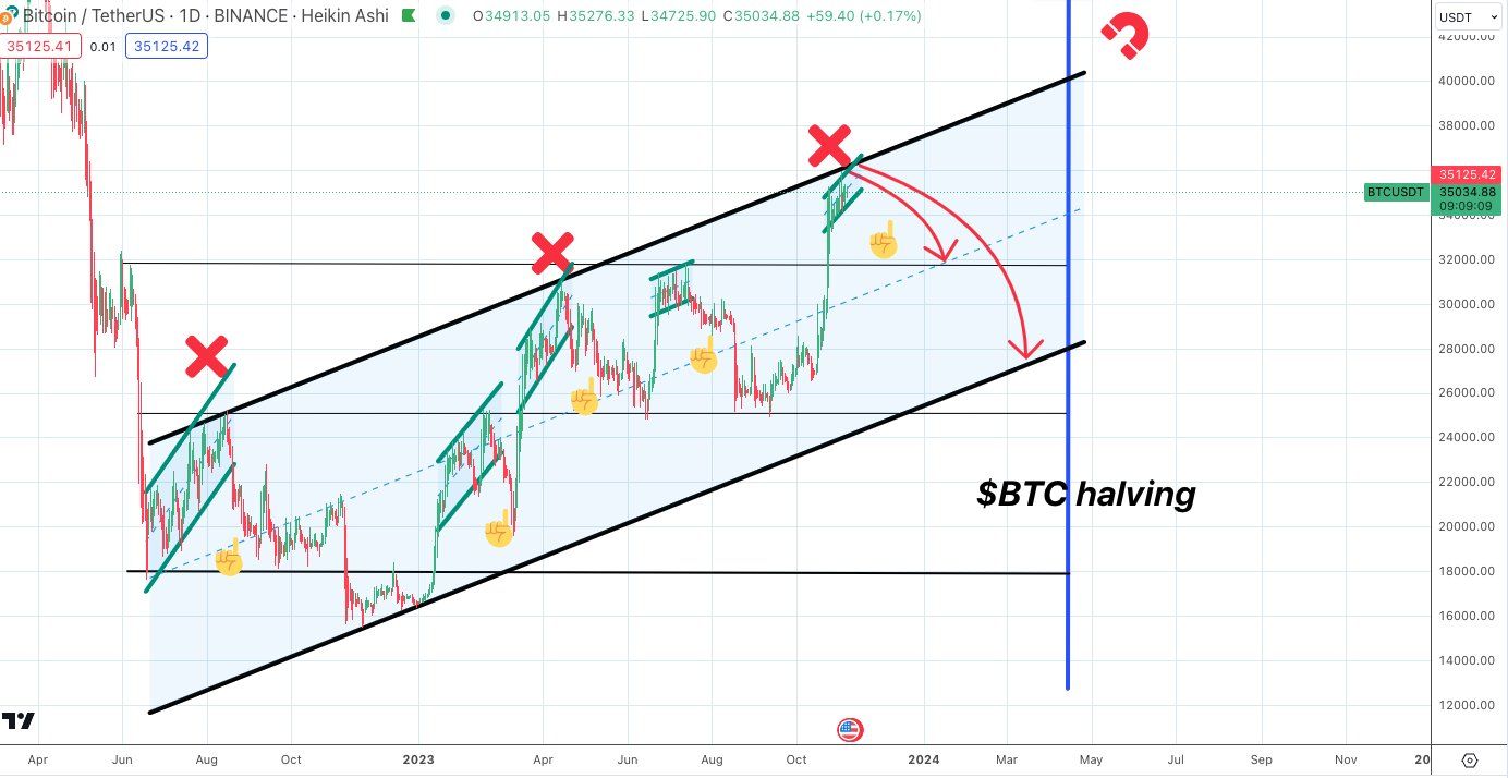 К мнению о том, что биткоин ждет коррекция, присоединился трейдер Doctor Profit. Он не исключает снижения BTC до халвинга, который состоится весной 2024 года. Свой негативный прогноз биткоина трейдер объяснил вероятным разрастанием FUD на фоне пристального внимания американских регуляторов к криптоиндустрии. Напомним, Комиссия по ценным бумагам и биржам США (SEC) видит признаки незаконно выпущенных ценных бумаг в ряде популярных криптовалют. Также под прицел регулятора практически одновременно попали две крупнейшие криптобиржи — Binance и Coinbase.