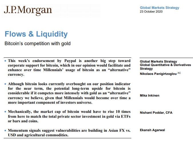 Аналитики JPMorgan уверяют, что биткоин может заменить золото в будущем в качестве защитного актива. Даже небольшое вытеснение золота, как альтернативной валюты, означало бы удвоение или даже утроение цены биткоина.