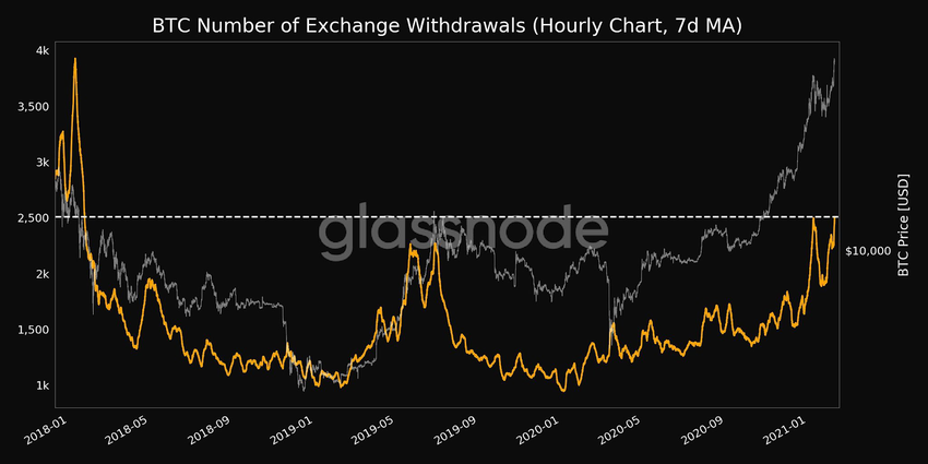 По данным аналитического сервиса Glassnode, инвесторы выводят биткоины (BTC) с криптовалютных бирж максимальными темпами за последние три года