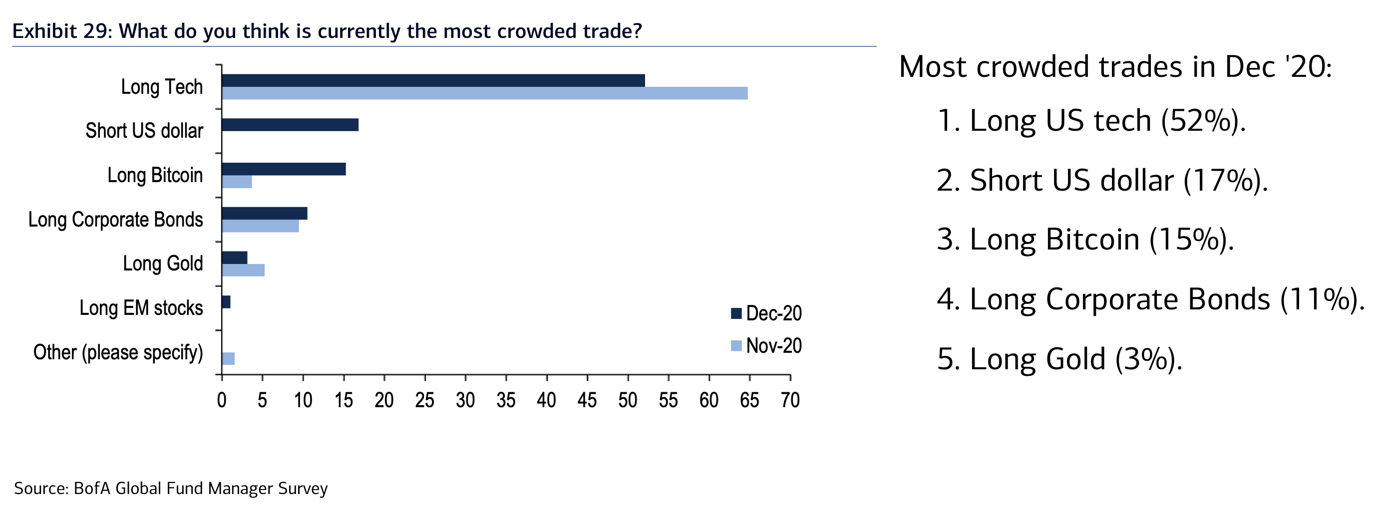 Чаще всего инвесторы покупали акции высокотехнологических компаний (52%). На втором месте по популярности продажа доллара (17%) и замыкает тройку дилеров покупка биткоина (15%). Иными словами, институциональные инвесторы верят в рост стоимости акций технологических гигантов и биткоина, а также ожидают падение курса доллара.