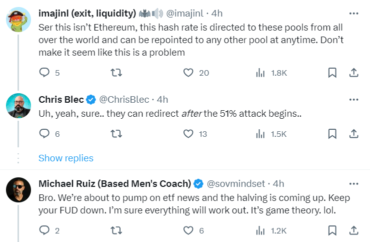 Часть подписчиков Блека не поддержала предположение о том, что биткоин в опасности. Один из пользователей обратил внимание исследователя на то, что майнеры могут перенаправлять хешрейт в другие пулы, а значит у потенциального организатора атаки нет стабильного объема вычислительной мощности. То есть даже если злоумышленник попытается атаковать BTC через пул, он может в любой момент лишиться необходимого хешрейта.