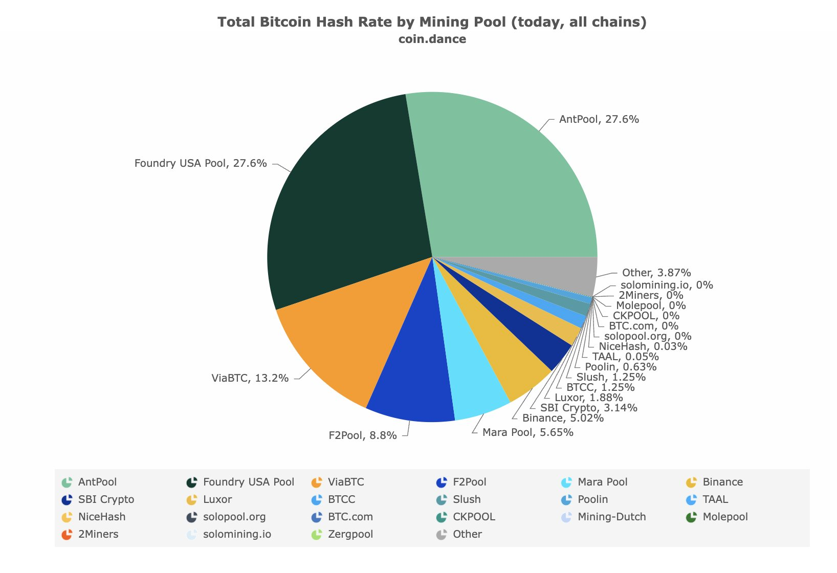 Крис Блек обратил внимание на то, что 55% хешрейта BTC — общего объема вычислительной мощности, направленной на майнинг криптовалюты — приходится всего на два майнинг-пула: Foundry USA Pool и AntPool.