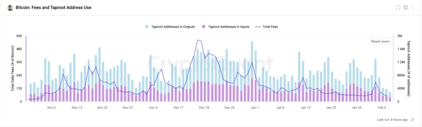 Более того, в сети Биткоин наблюдается спад транзакций c ежедневного рекордного уровня в 731 тыс. в конце декабря 2023 года до трехмесячного минимума в 278 тыс. Cнижение напрямую связано со спадом интереса к токенам BRC-20 и сокращением использования адресов taproot на 76%. Комиссии за транзакции также резко просели, упав на 90% с середины декабря по начало февраля.