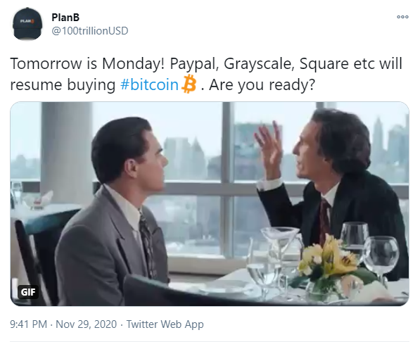 Три крупные компании, такие как Paypal, Grayscale, Square, намерены купить биткоины, считает известный блогер Plan B, который регулярно освещает события на рынке криптовалют.