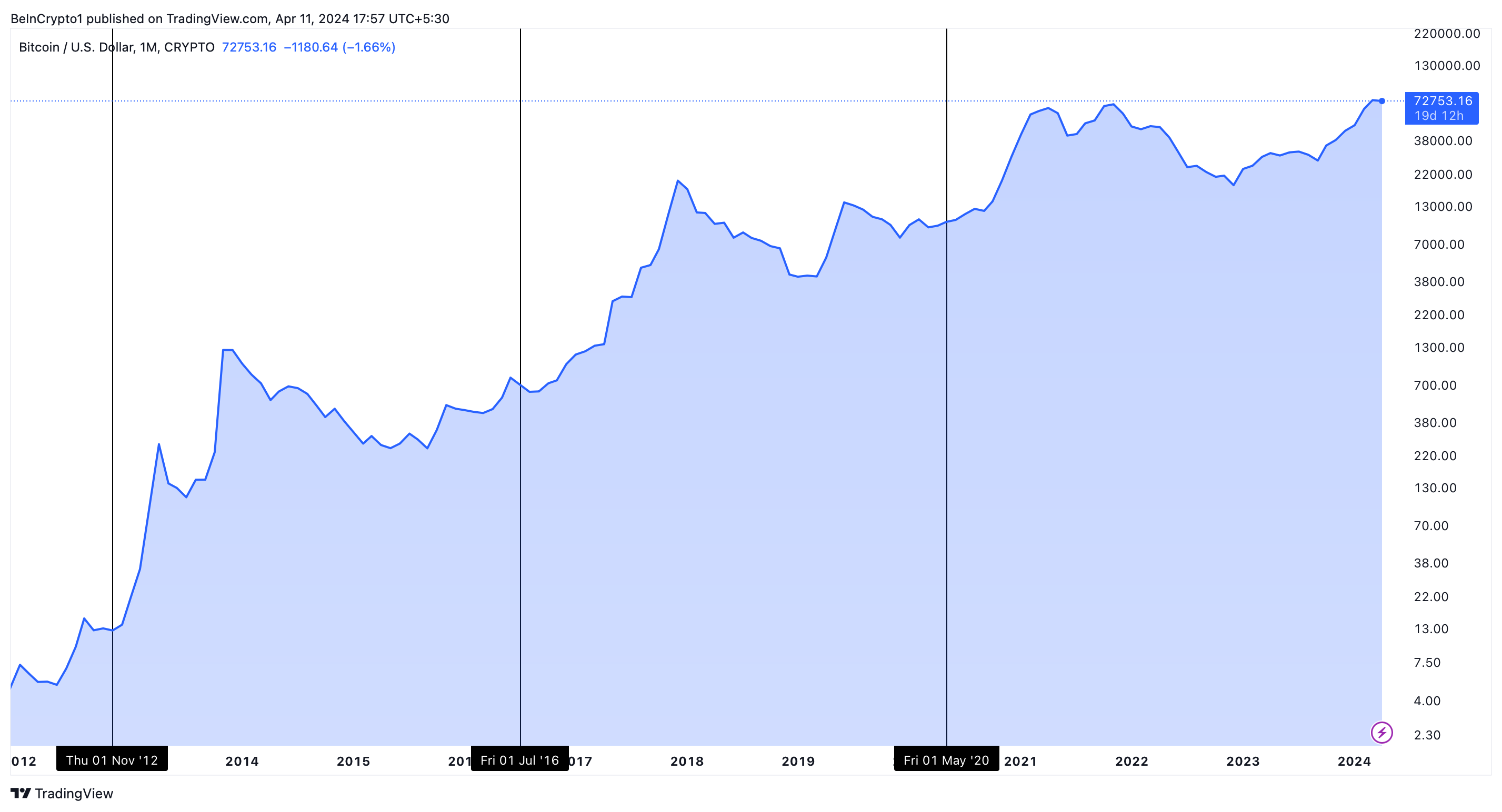 Так, после первого халвинга в ноябре 2012 года стоимость BTC увеличилась с $12 до более чем $1 000 только к концу 2013 года. Аналогичная ситуация случилась и после второго события в июле 2016 года — курс биткоина поднялся с $650 до почти $20 тыс. лишь к декабрю 2017 года. В прошлом цикле сценарий повторился: цена первой криптовалюты пробила рекордной отметки в $69 тыс. спустя полтора года после халвинга.