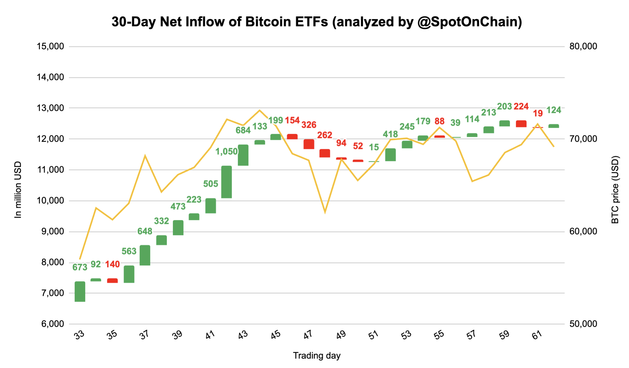 «Технические индикаторы, такие как графики цен и объема торгов, могут дать представление о настроениях на рынке. В то же время новости и обсуждения в социальных сетях вокруг биткоина и халвинга могут выявить настроения инвесторов. Анализ данных ончейн, например, активные адреса или приток/отток средств на бирже может, в свою очередь, указать на поведение инвесторов. Наконец, чистый приток средств в спотовые биткоин-ETF отражает поведение покупателей», — пояснила Фунг.