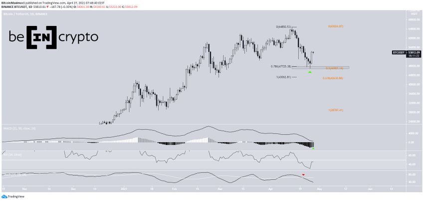Биткоин снижается с 14 апреля после достижения максимума на уровне $64 854. Падение ускорилось 18 апреля. Цена достигла локального минимума 25 апреля на уровне $46 930 и начала восстанавливаться. Сейчас BTC торгуется вблизи $54 700.