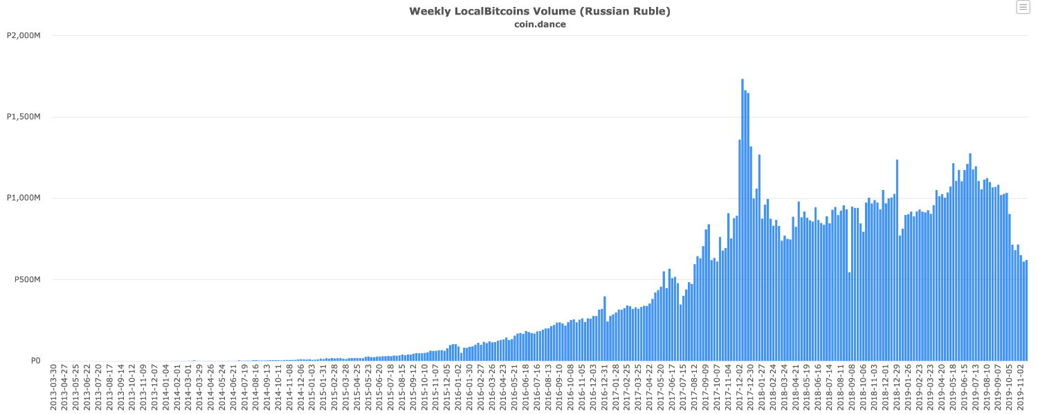 По данным аналитического сервиса CoinDance, за минувшую неделю объем торгов биткоинами (BTC) в паре с рублем на платформе LocalBitcoins вырос до 620 млн рублей (около 10 млн долларов), отодвинувшись от годовых минимумов, зафиксированных неделей ранее на уровне 610 млн рублей. Несмотря на незначительное улучшение, спрос на криптовалюту в России остается низким, а объем торговли устойчиво снижается с июня 2019 года, когда был зафиксирован годовой максимум на уровне 1,29 млрд рублей.