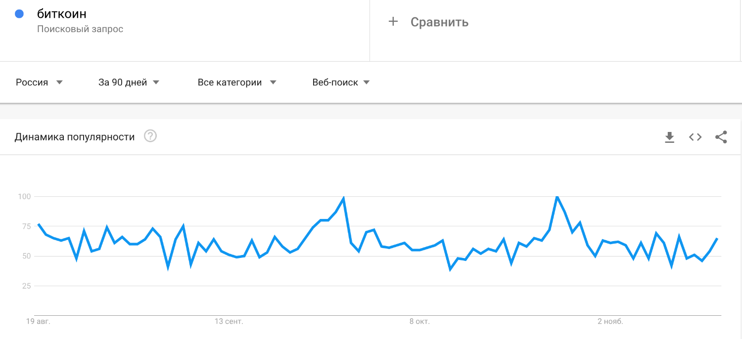 Аналогичную динамику показывает статистика поисковых запросов c ключевым словом «биткоин». По данным аналитического сервиса Google Trends, после незначительного всплеска поисковой активности в конце октября, интерес российских пользователей интернета к информации, связанной с биткоином и криптовалютами в целом существенно снизился, вернувшись к уровням начала года.