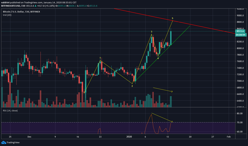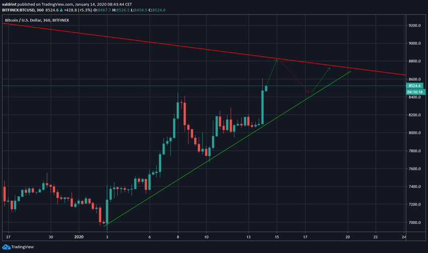 8 января курс BTC достиг максимума на $8,442, но с тех пор снижался, двигаясь вдоль линии нисходящего сопротивления. Вчера рынок совершил энергичный бычий прорыв этой отметки. Пробой сопротивления сопровождался существенными торговыми объемами, однако они все равно не дотягивают до показателей, сопровождавших предыдущую волну роста.