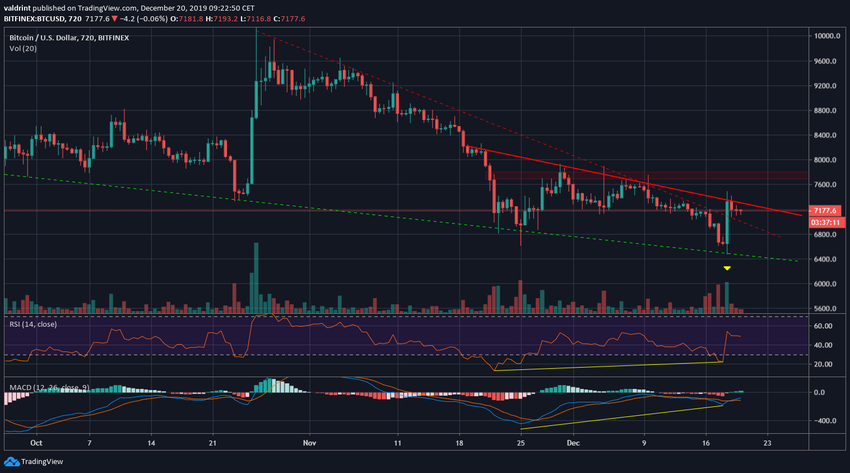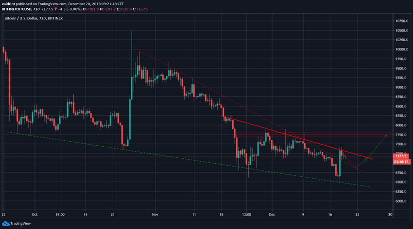 Кроме того, в это же время биткоин, по всей видимости, сформировал двойное основание в районе $6500. Торги проходят между 200- и 400-часовой скользящими средними (MA). Если одна из них будет пробита, это может обусловить устойчивый и быстрый ход в данном направлении, будь то север или юг.
