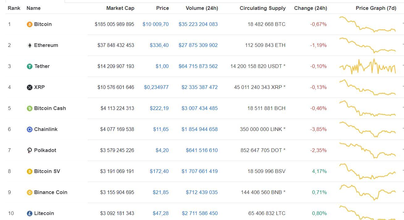 Самая капитализированная криптовалюта – биткоин (BTC) – встретила вторник очередной волной негативного движения. На момент написания новости, монета торгуется близ $10 тыс.