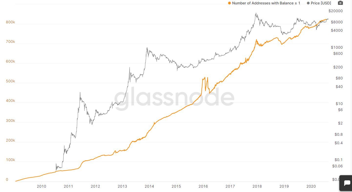 Примечательно, что несмотря на снижение курса биткоина, количество пользователей, на счету которых есть как минимум 1 BTC, достигло рекордного значения.