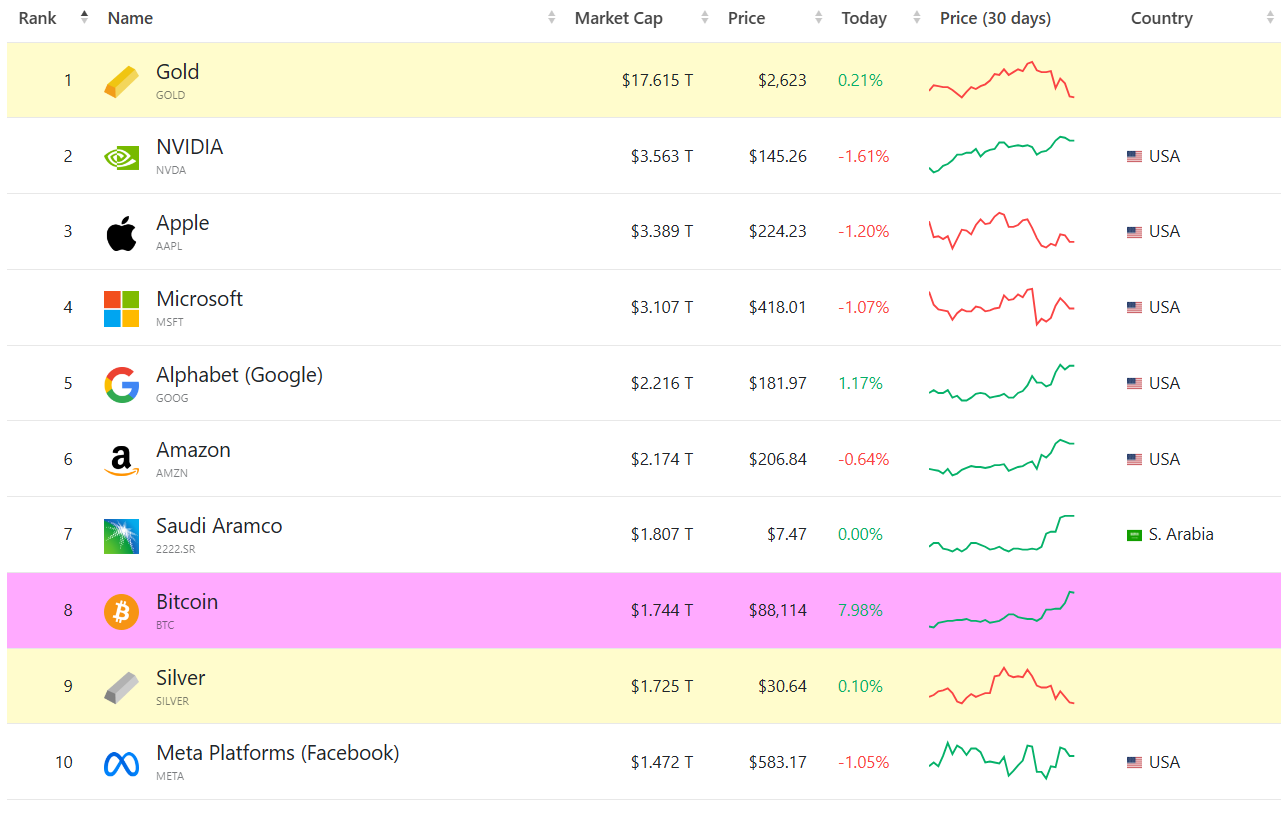 В начале волны роста биткоину удалось обойти признанную в РФ экстремистской Meta Марка Цукерберга в рейтинге самых капитализированных активов. Теперь BTC обогнал и серебро, закрепившись на восьмой строчке общего зачета. Ранее, на фоне роста весной 2024 года, биткоин в моменте уже опережал драгметалл.
