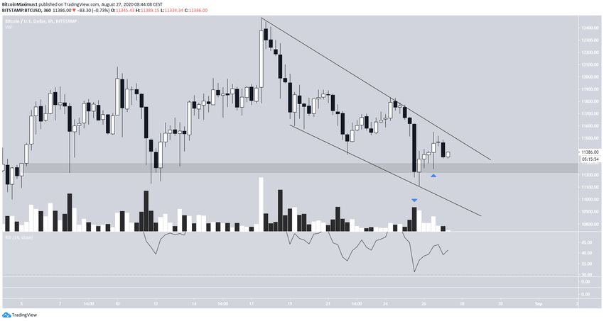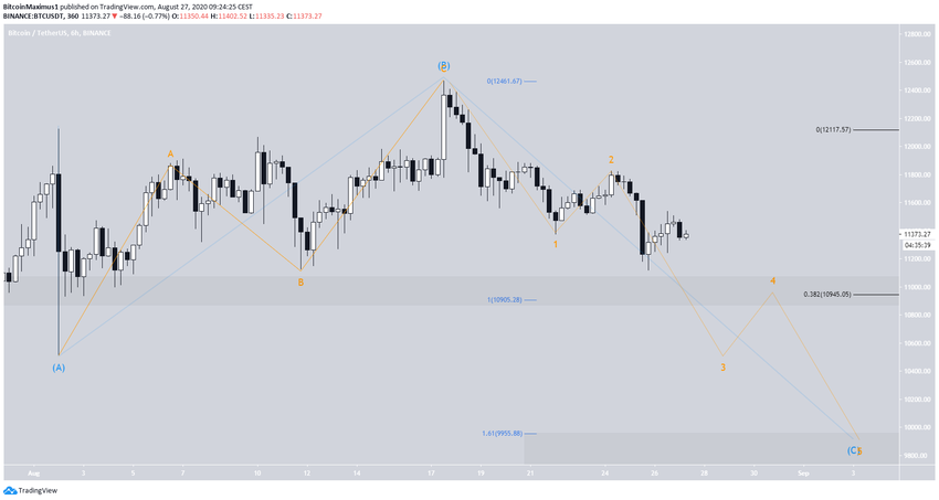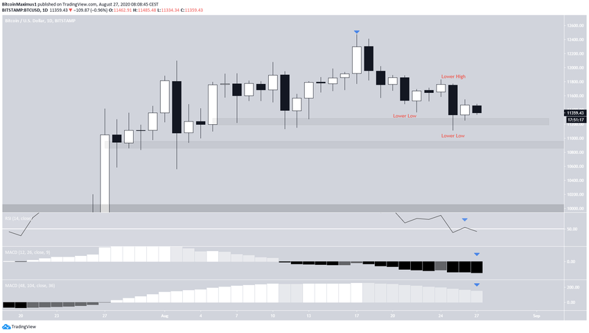Биткоин снижается с момента достижения максимума $12 468 17 августа. С тех пор цена сформировала один понижающийся максимум и два понижающихся минимума.