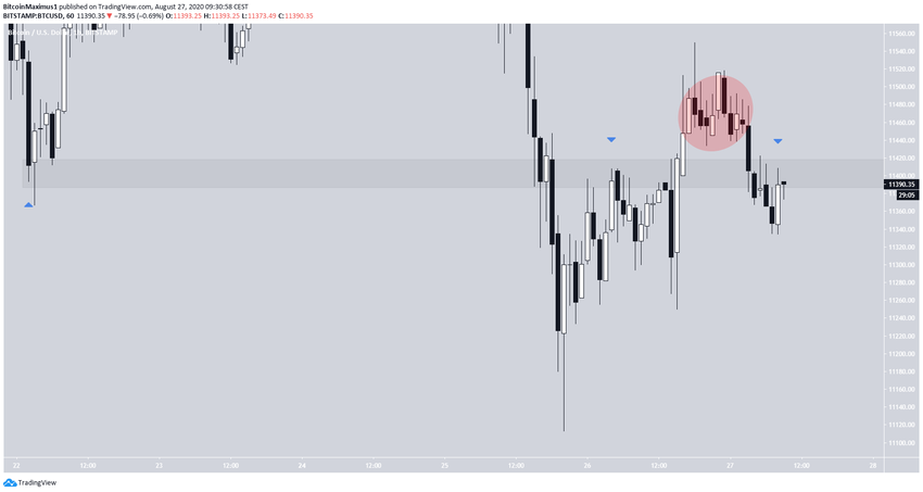 На часовом графике видно, что изначально криптовалюта пробила зону $11 400, которая ранее выступала в роли сопротивления. Но уже в скором времени цена отступила, возвращая этому уровню статус сопротивления.