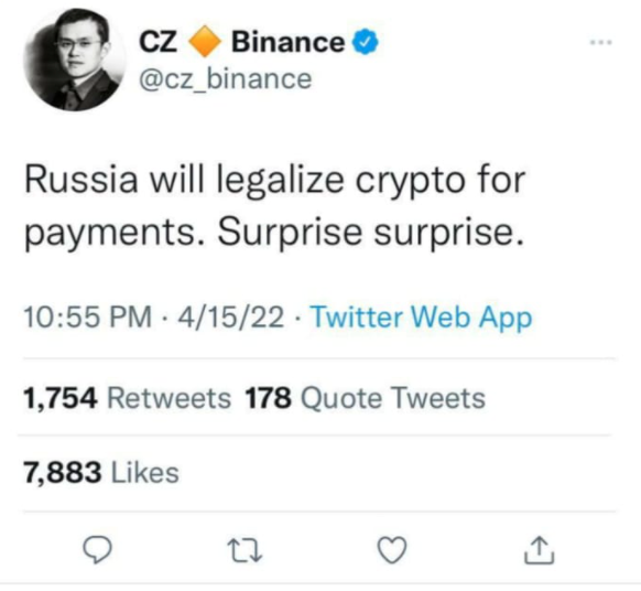 Эта новость породила волну хайпа и спекуляций о том, что в России якобы собираются узаконить криптовалюту, как платежное средство. В частности, глава криптовалютной биржи Binance Чанпен Чжао написал в твиттере: