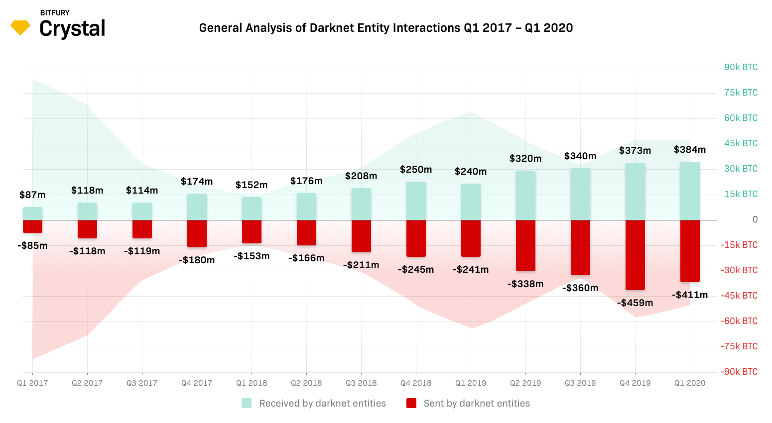 Доля биткоинов, отправленных от одного объекта даркнета к другому (т. е. все транзакции между различными объектами даркнета), также выросла с 10% в 1 квартале 2019 года до 19% в 1 квартале 2020 года, что указывает на общий рост доходов и сотрудничества в даркнет.